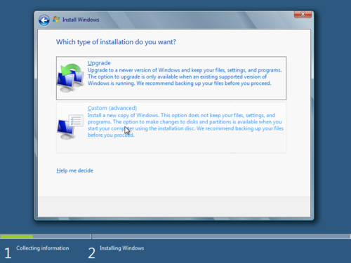 Eger halihazırda bir işletim sisteminiz varsa “Upgrade” aksi halde sıfırdan kurulum için “Custom(Advanced)” kısmına basın.